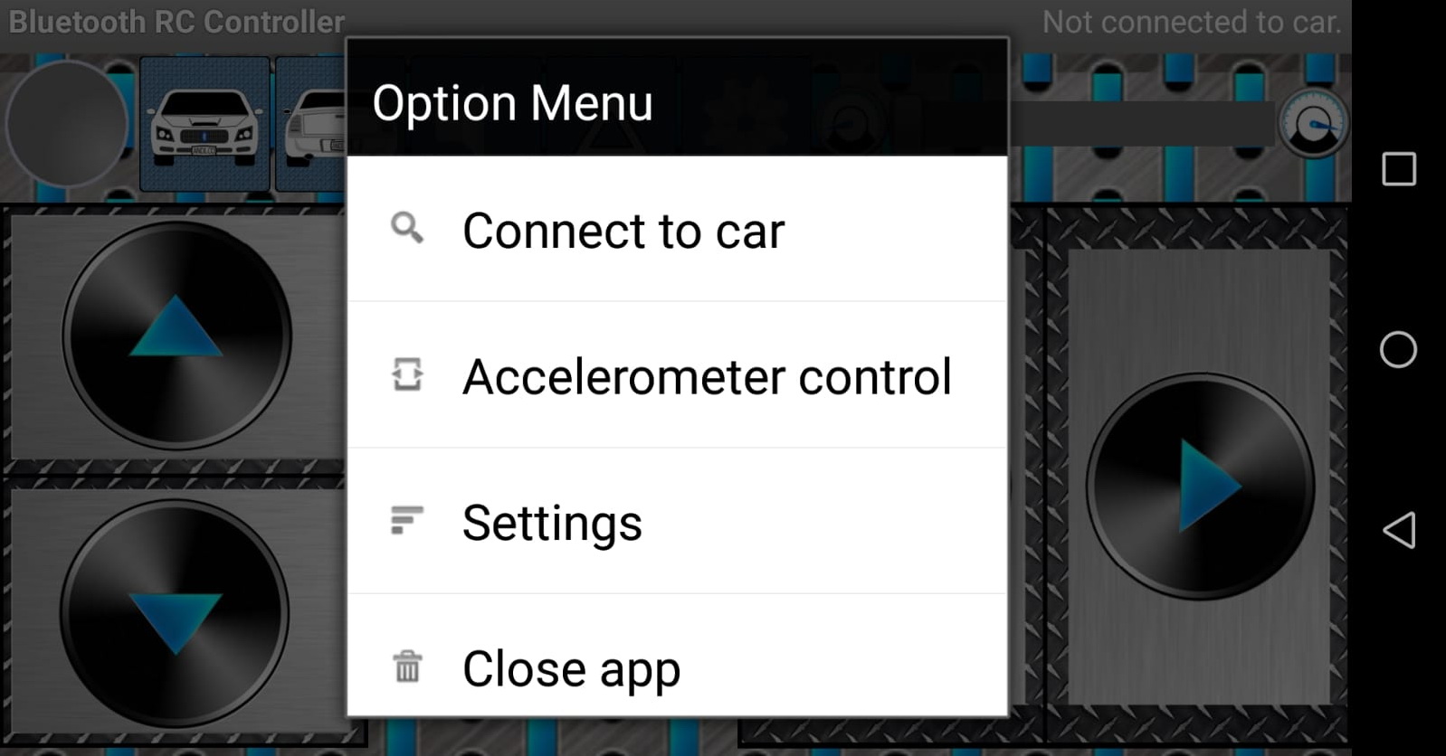 Para poder manejar ahora el coche deberemos instalar en nuestro dispositivo móvil una aplicación que envíe los datos correspondientes a través de Bluetooth a nuestro coche y realice la acción asociada al dato recibido. En la Google Play Store podemos encontrar alguna aplicación que nos permite controlar nuestro coche. Hay quien ha realizado el trabajo por nosotros y ha diseñado una muy completa aplicación llamada Arduino Bluetooth RC Car y que puede verse en el siguiente enlace