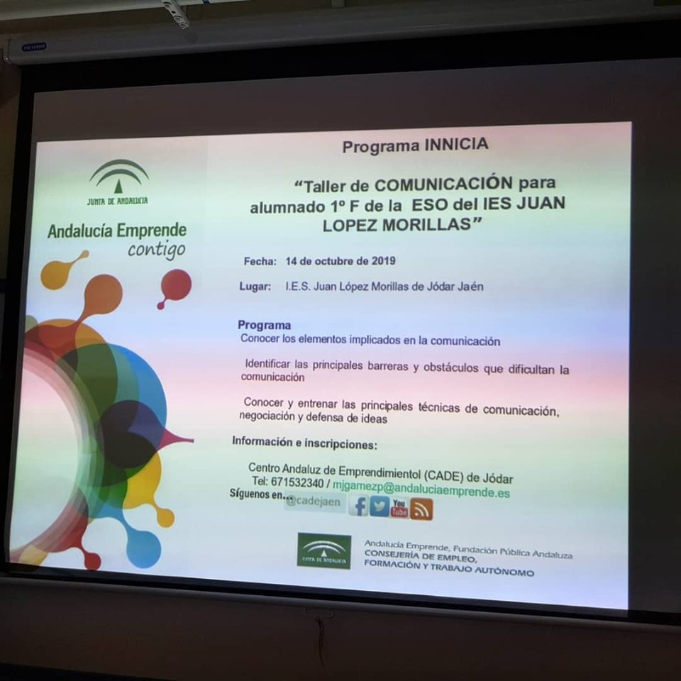 Desde el 14 de octubre de 2019, está teniendo lugar el Taller de Comunicación impartido al alumnado de 1º de ESO del IES Juan López Morillas de Jódar. El taller se realiza a cargo del Centro Andaluz de Emprendimiento (CADE) de Jódar, dentro del Programa Andalucía Emprende Contigo de la Junta de Andalucía.