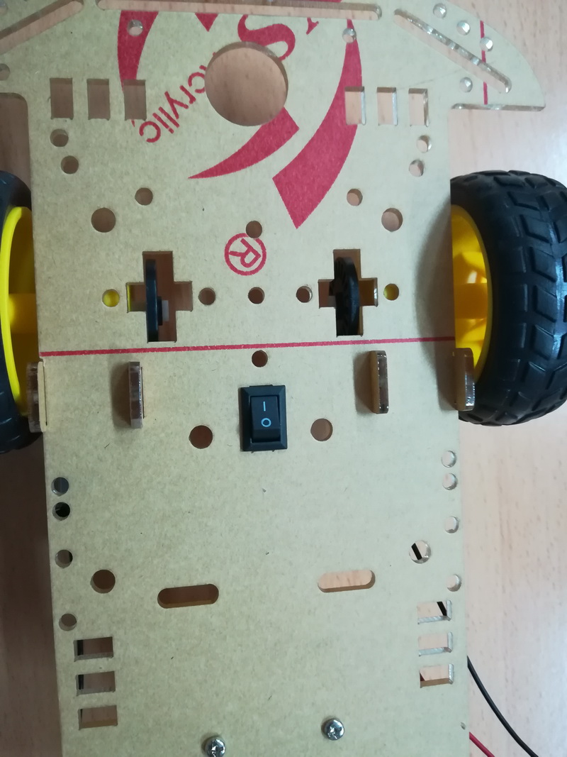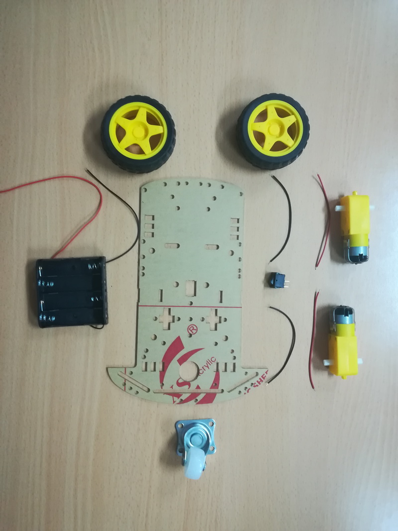 El kit viene con una plataforma perforada y toda la tornillería para poder montar los dos motores que moverán las ruedas, una rueda loca, un portapilas y un interruptor.