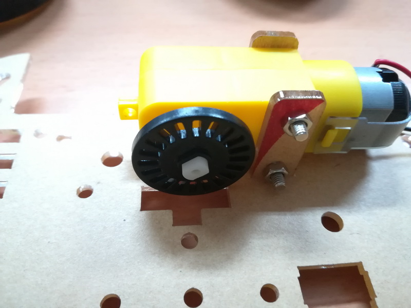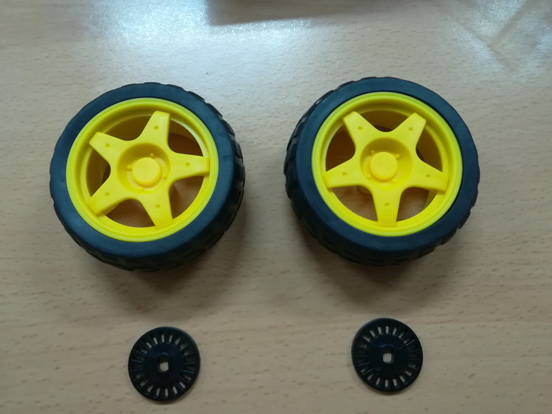 Es el momento ahora de colocar las ruedas en los motores. En primer lugar colocaremos los discos encoders, esas ruedas oscuras pequeñas, que en este proyecto no vamos a utilizar, pero que sirven para igualar la velocidad de giro de ambos motores y que constituye una posibilidad de mejora y ampliación de nuestro proyecto. Nos aseguraremos de que ningún elemento roce con la plataforma para que nuestros motores no sean frenados, ni que tampoco rocen las ruedas con el final del eje del motor.