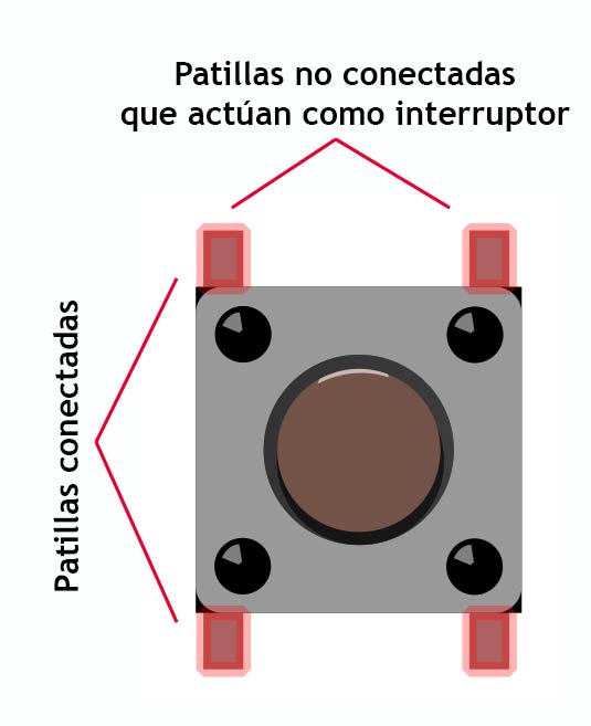 El pulsador que tenemos en la figura es un pulsador NA, luego cuando pulsamos cierra sus contactos y deja pasar la corriente. De esta manera por ejemplo podemos encender un diodo LED o cualquier otro elemento.