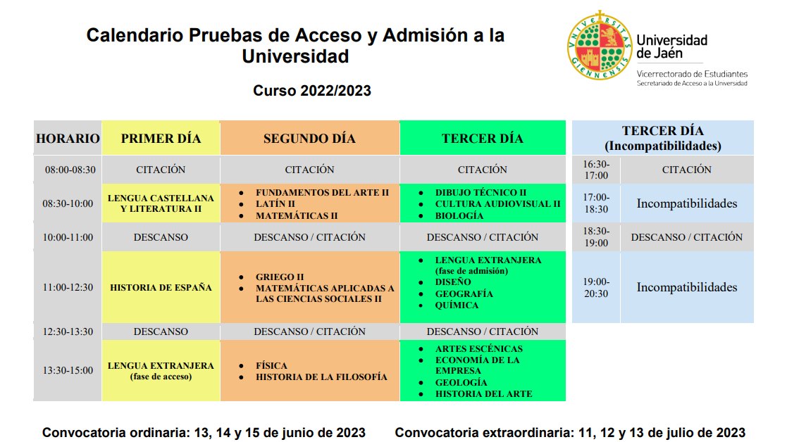 El Secretariado de Acceso a la Universidad del Vicerrectorado de Estudiantes de la Universidad de Jaén ha hecho público el calendario correspondiente a las Pruebas de Acceso y Admisión a la Universidad para este curso.