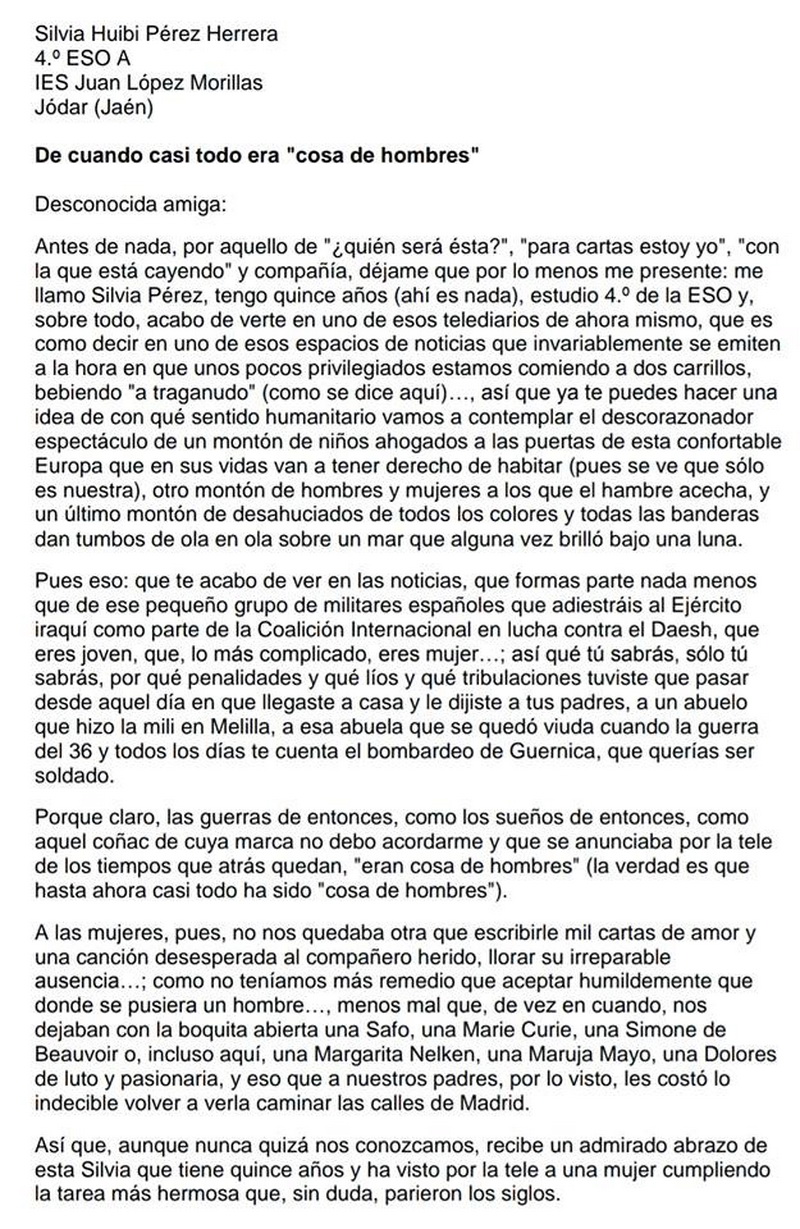 La alumna del IES Juan López Morillas, Silvia Huibi Pérez de 4ºESO A, ha sido la ganadora del 2º premio en la fase provincial del 6º Concurso Literario Escolar, CARTA A UN MILITAR, que se centra en esta edición en la incorporación de la mujer en las Fuerzas Armadas y tiene como lema ”30 años trabajando en igualdad”.