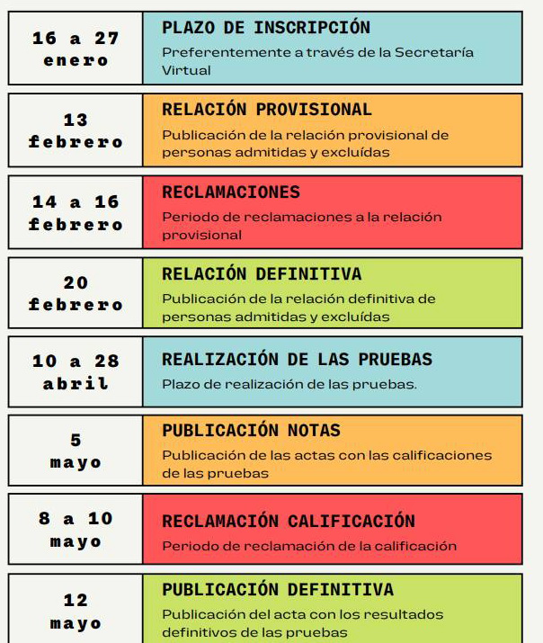 Este curso 2022/2023 se llevará a cabo, una única convocatoria de pruebas de acceso en el mes de abril y el plazo de solicitudes será del 16 al 27 de enero de 2023.