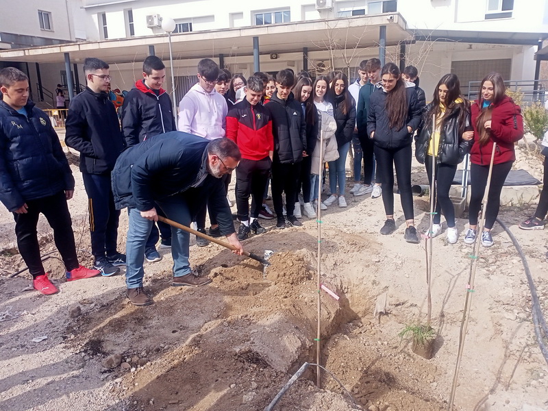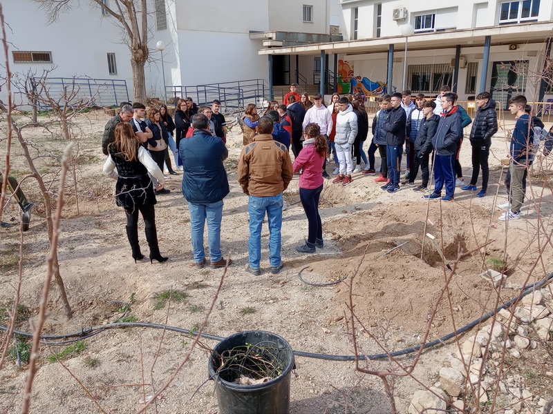 El viernes 24 de febrero a las 11.30 horas se realizó una plantación en el jardín frente a la cafetería (patio de recreo de 4º ESO), como presentación de la futura "Aula verde abierta" de nuestro centro. Este jardín botánico tiene una importante colección de variadas especies vegetales muy valiosas por su interés como patrimonio agrícola y etnobotánico, procedentes de nuestro antiguo arboreto, que se ha visto y se verá ampliada con la incorporación de nuevas plantas, como el acerolo rojo y amarillo, un grupo de serbales, kum kuats, naranjo tarocco rosso, mahonías, higuera brevera, naranjo de sangre y un grupo de Eleagnus o árboles del paraíso de distintas variedades. Además, este huerto contará con infraestructuras no vegetales que habilitarán este espacio como un aula inclusiva muy real, nada virtual, donde poder trabajar tareas multidisciplinares.