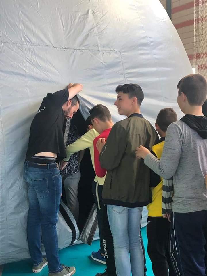 El la mañana del lunes 6 de mayo el alumnado de 1º de ESO del IES Juan López Morillas ha inaugurado el Planetario Móvil instalado en el Pabellón cubierto del Polideportivo Palomares de Jódar.